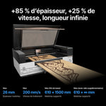 En prime, il prend en charge des matériaux allant jusqu’à 26 mm d'épaisseur à une vitesse de traitement de 200 mm/s, élargit votre surface de travail de plus de 100 %, et garantit un flux fluide et stable grâce à ses rouleaux parfaitement conçus.