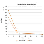 Ce graphique montre les résultats de deux études menées par des laboratoires de microbiologie aux États-Unis et au Chili1,2. Les deux études confirment que les unités formant colonie (CFU) de Staphylococcus aureus MRSA et Escherichia coli DH5α, chutent brusquement pendant les 6 premières heures d'exposition aux PLACES (>95%), poursuivant l'élimination des souches bactériennes jusqu'à atteindre une élimination >98% à 8 heures et >99,99% à 24 heures.