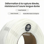 Le TPU est un filament flexible offrant une grande élasticité, une excellente résistance aux chocs et une adhérence parfaite entre les couches. Il est idéal pour imprimer des pièces nécessitant de la flexibilité, de la compression ou une absorption des chocs, telles que des joints sur mesure, des coques de protection, des bracelets pour appareils portables ou encore des composants industriels fonctionnels comme des supports antivibrations.