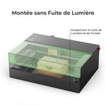 En plus de vous offrir des possibilités de gravure sur des supports plus hauts, l'élévateur xTool vous permet de fermer votre P2 de façon complètement hermétique afin d'éviter toute émission de lumière ou de fumée. (Cela ne fonctionne pas avec le convoyeur automatique.)
